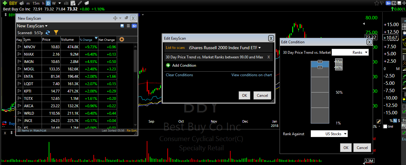 I’m very fond of EasyScan for one reason, you can choose how the stocks that show up in your scans rank against another security or set of securities, for the criteria you are scanning. For example, in the image below, I am scanning the list of the Russell 2000 ETF from iShares, and I’m using the 30 price trend against the market. So rather than choose an arbitrary value like most scanners, I want to see the top 10% of the Russell 2000 based on their performance against all US stocks. You can keep narrowing your selection until you have a few stocks that have massively outperformed the market.