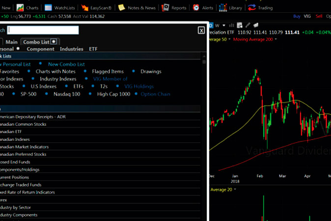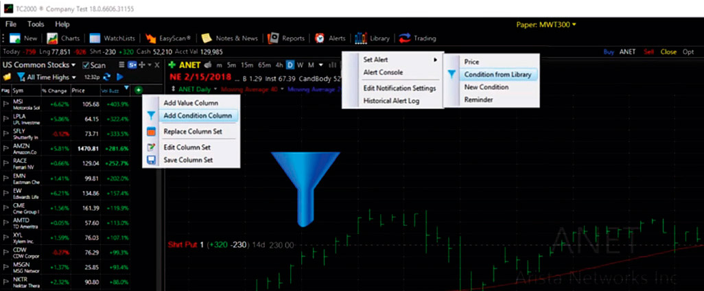 New is Notes and News, a dropdown feature that allows you to automatically link the active symbol with major financial websites such as Google and Yahoo Finance pages, MarketWatch, StockTwits, and so on. EasyScan editors and condition columns continue to be updated in order to streamline building criteria using any indicator and immediately seeing the stocks that meet those criteria. Condition Count Reports are reports that can track multiple EasyScans at one time. Counts are continually updated so you can see stocks that meet the EasyScan criteria in real time. The number of scans that can be run simultaneously is based on service level.